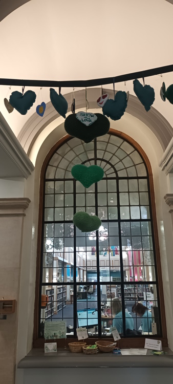 Lara and Joy put up our green love heart bunting, fabric hearts, and postcards in Lincoln Central Library.