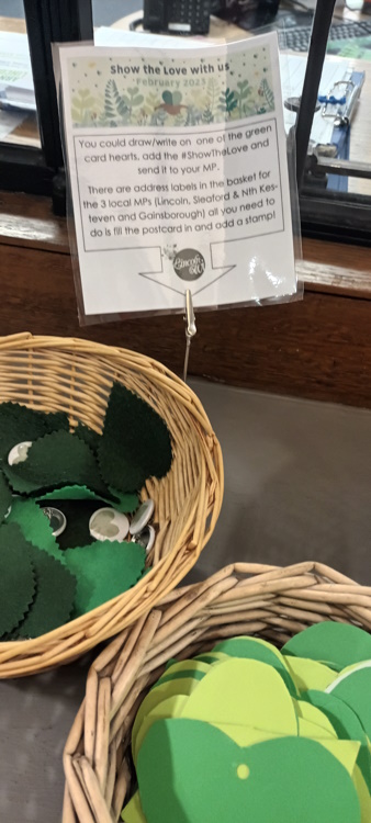 The display is still up and you can grab a postcard and a label to post to one of the local Lincoln MPs.