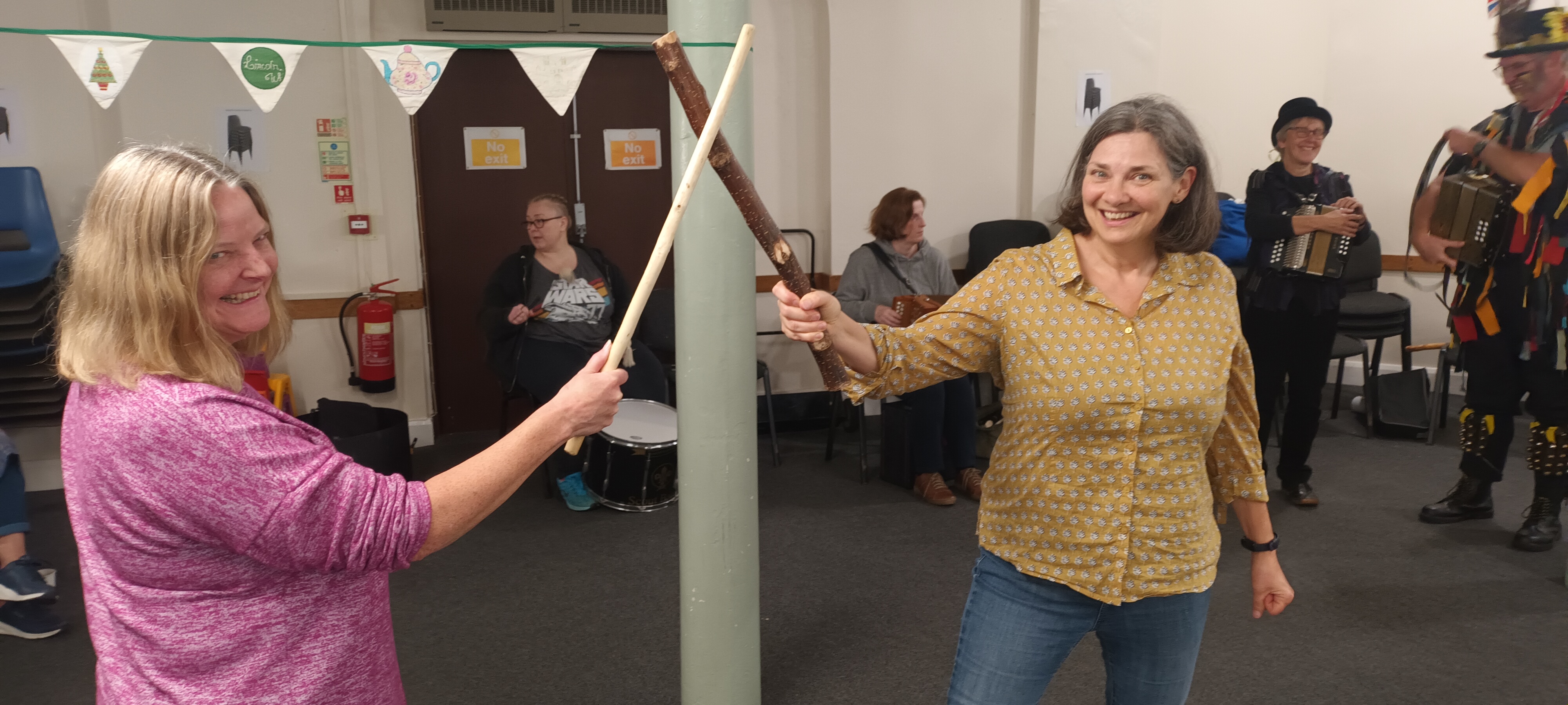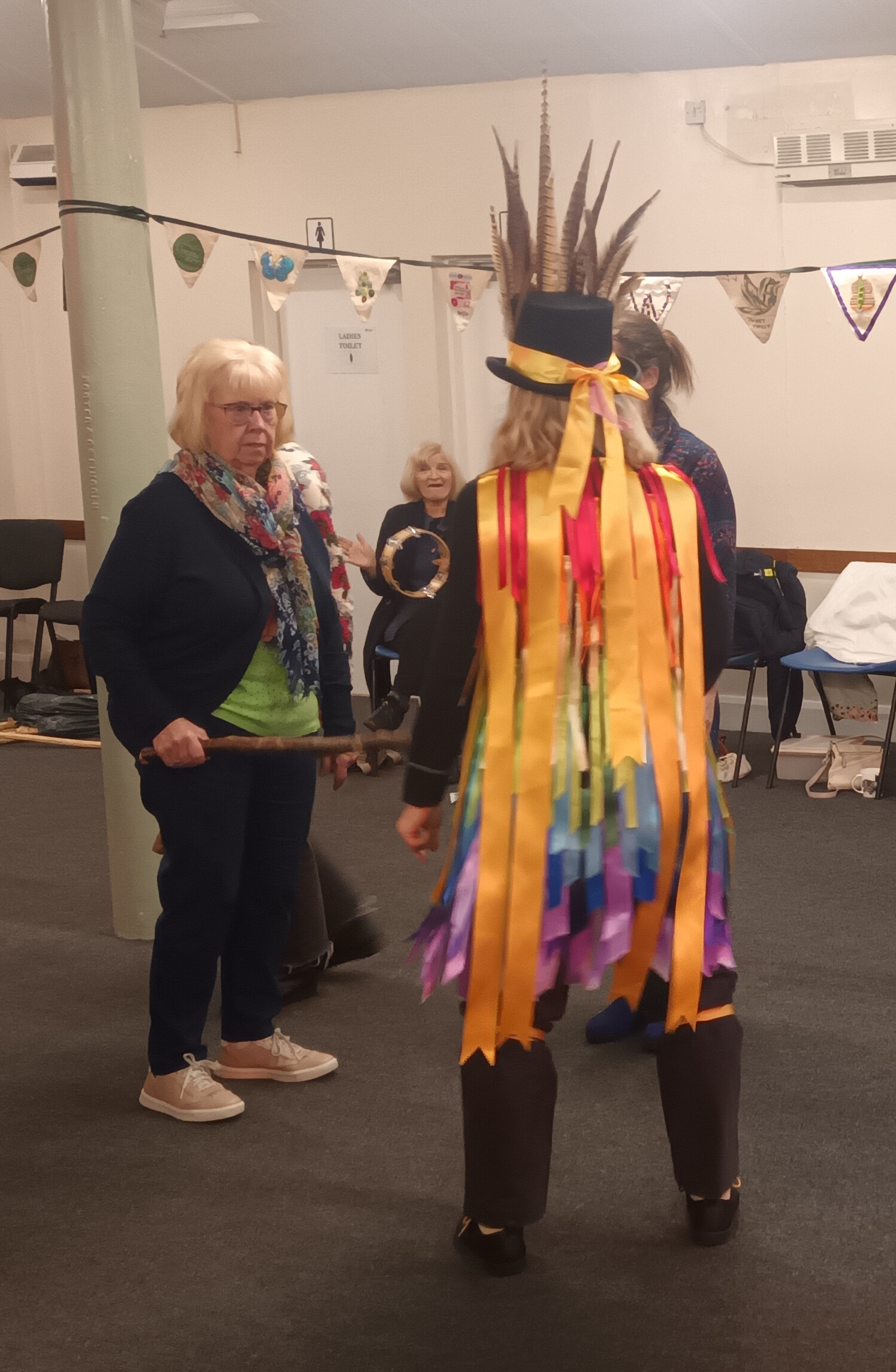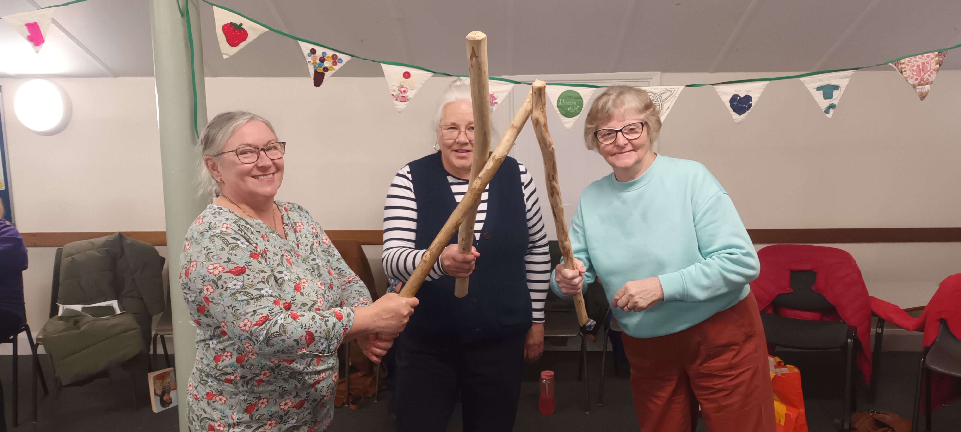 After a demonstration, we got to join in, everyone was encouraged to grab a stick in order to hit their neighbours, and groups of two WI members and one Poacher Morris formed. We got to menace each other, hit each other’s sticks and tell others to “sod off”.