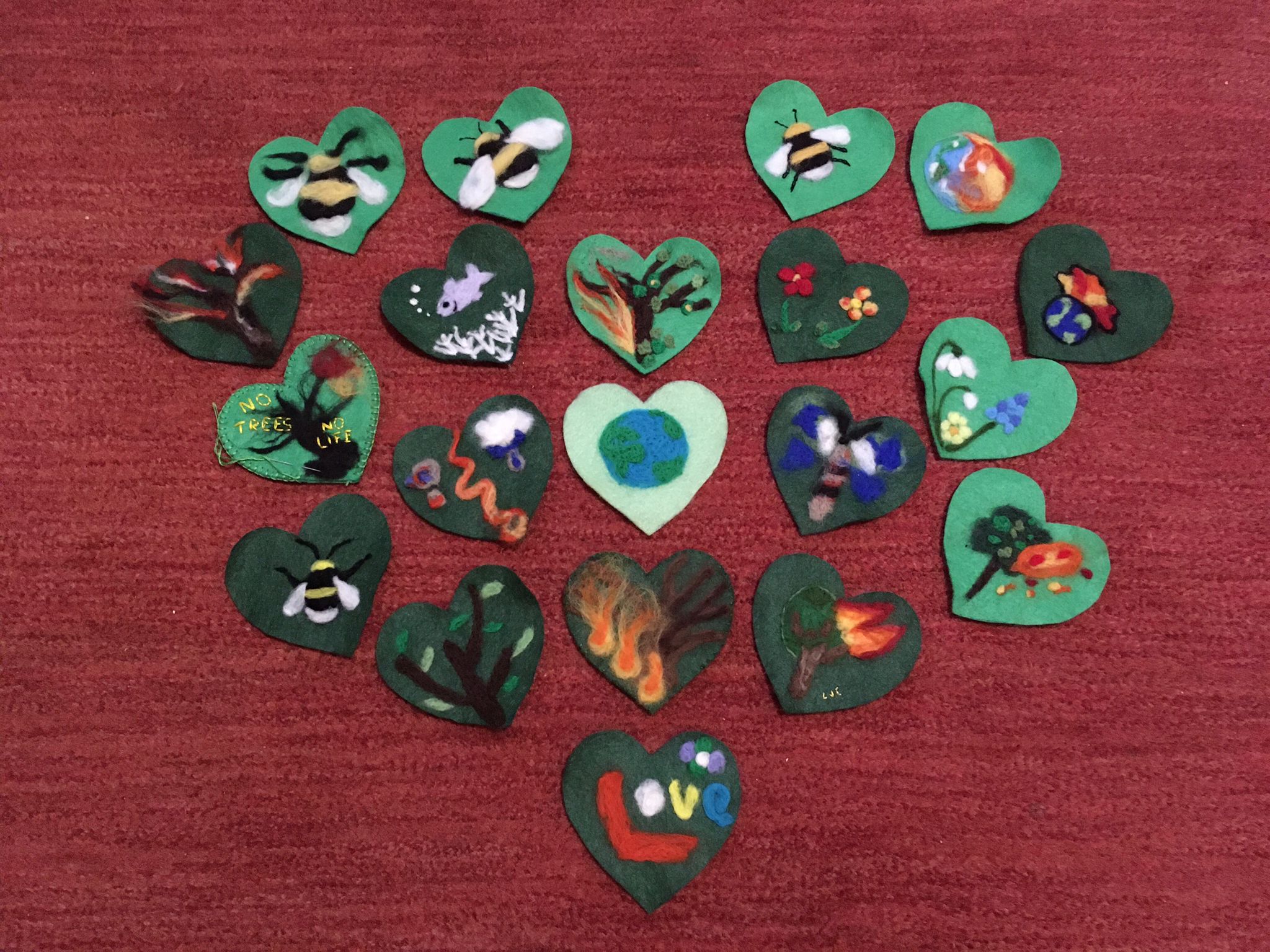 Previously members have embroidered love hearts onto upcycled fabric, painted love hearts, made bunting and sent messages to local politicians to raise awareness. This year we decided to use the skills of member Nina, and make felted love hearts and write messages on green cardboard hearts. Our craft club then will make them into bunting.
